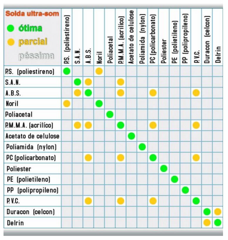 Resina, materiais com fibra de vidro apresentam maior dificuldade de solda, já que a fibra não se funde. Neste caso deve utilizar máquinas de solda mais potentes para garantir a fusão da fase polimérica do composto. Os materiais das peças a serem soldadas devem ser compatíveis entre si.